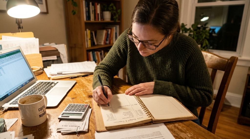 Mulher anotando gastos em caderno com notebook e calculadora.